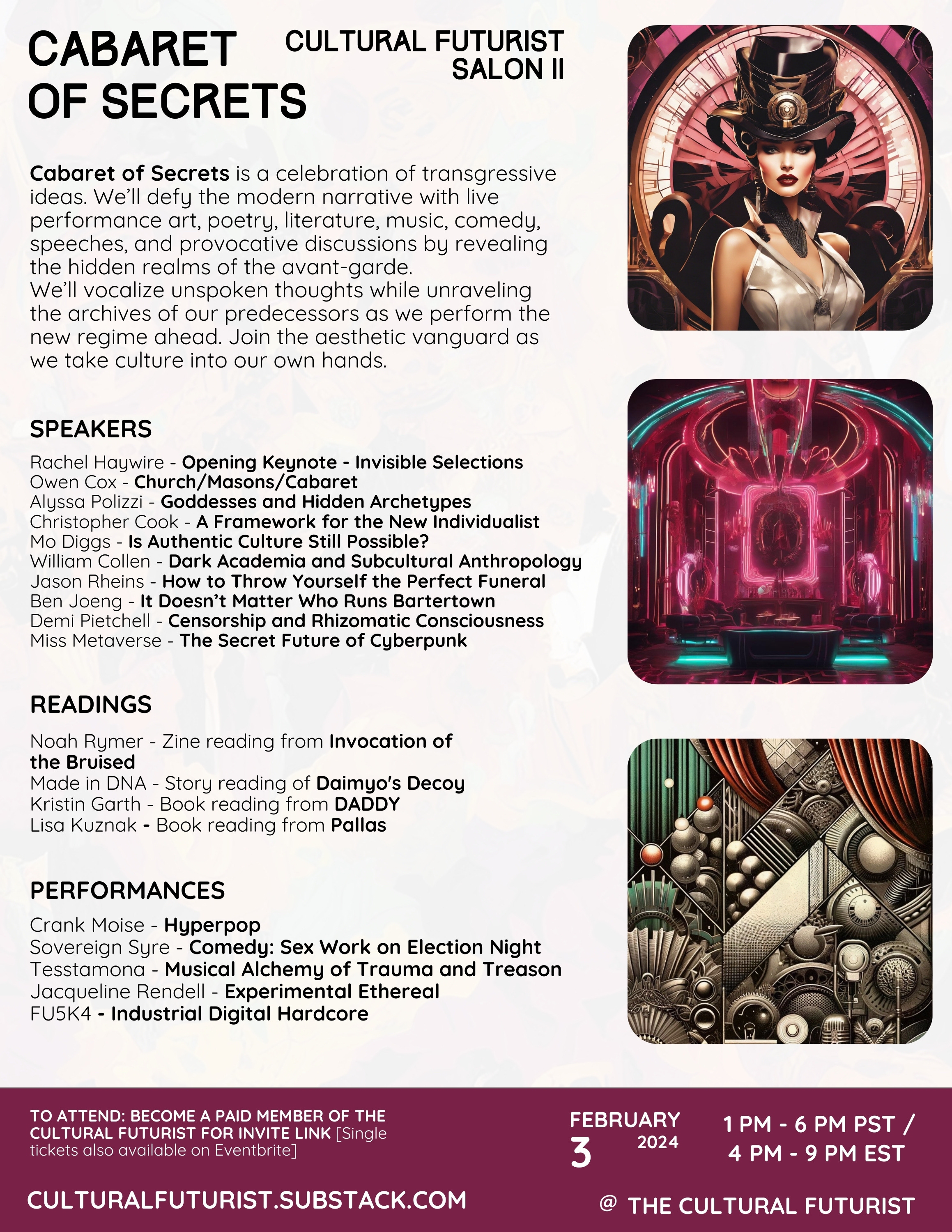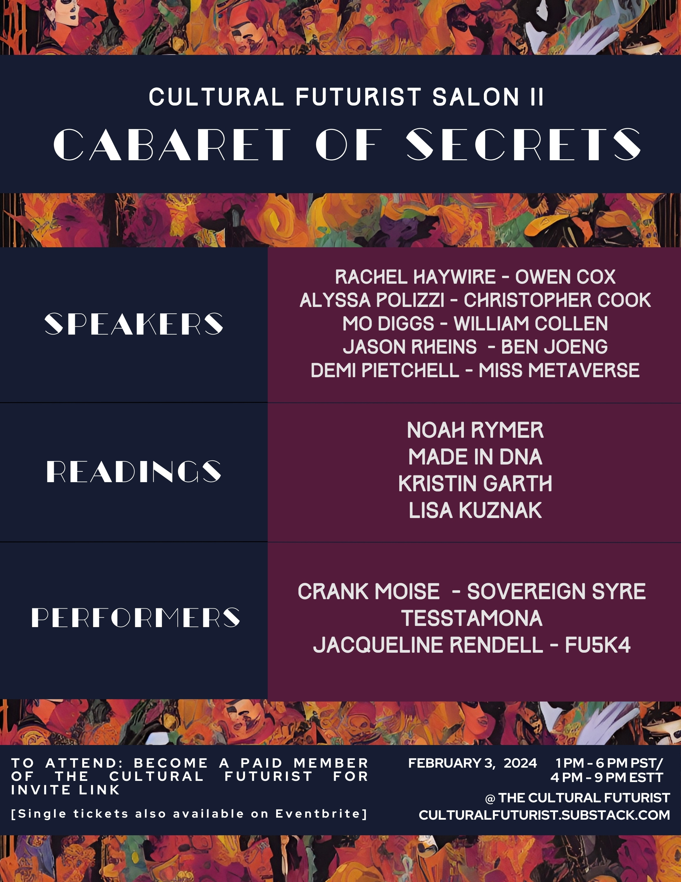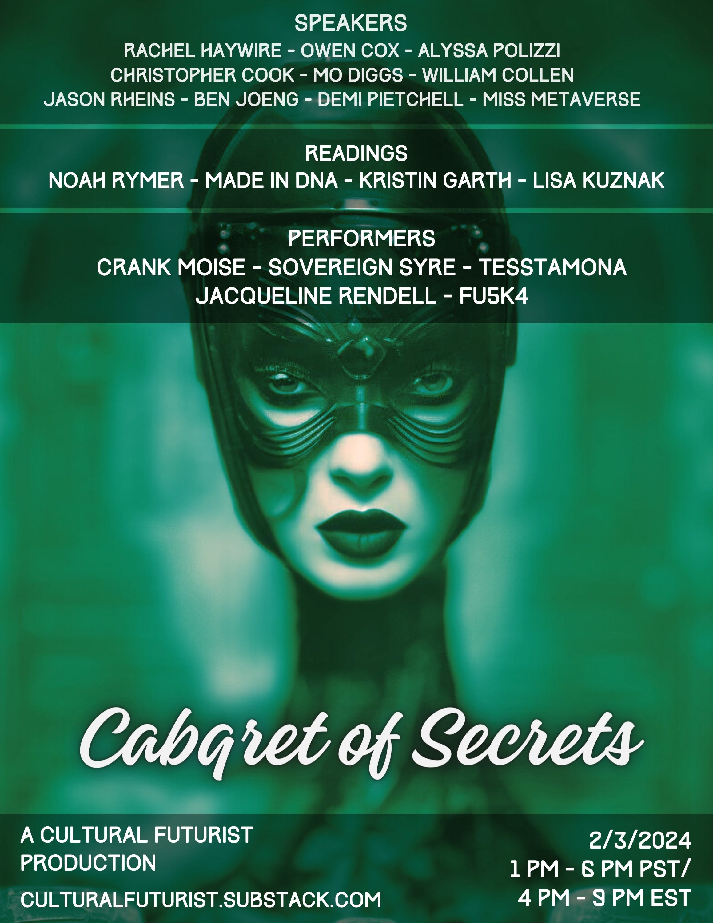 I am honored to be among the speakers for Rachel Haywire’s Cabaret of Secrets this Saturday. The event starts at 4pm Eastern. Info below. Hope to see you there!