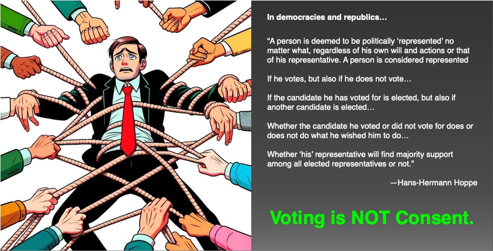 We are going to force you to do things, force you not to do things, take your money, and punish you if you resist. We have given you the right to vote, and that means that you have consented to anything and everything we do from here on in.