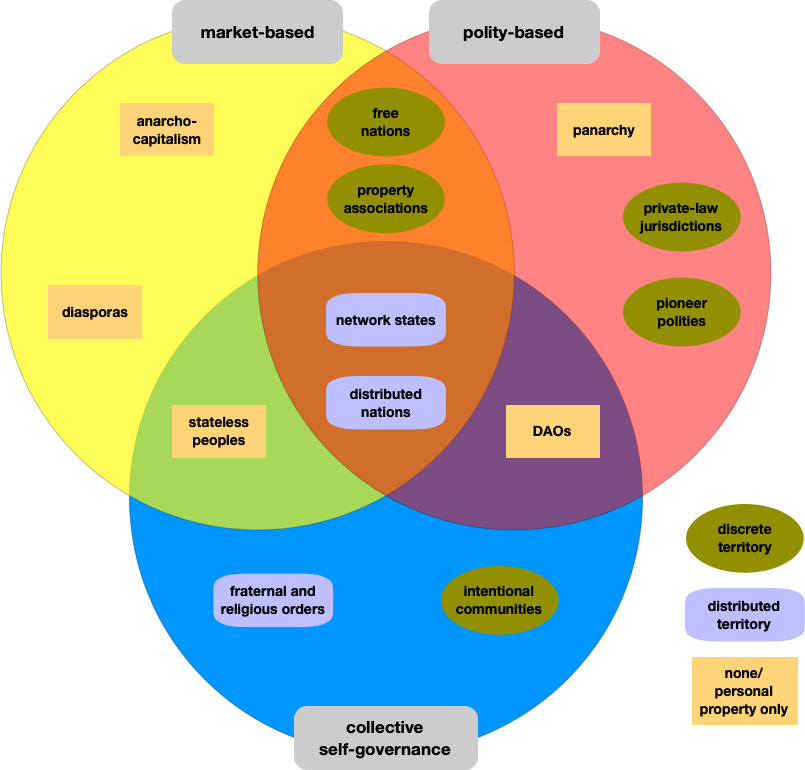 The network state occupies the overlap of all three of our top-level categories. It has a recognized leader, a shared mission, a high degree of group consciousness, and a capacity for self-governance. And yet, because of its distributed nature, its members would likely have to rely on market agencies for the provision of certain services.