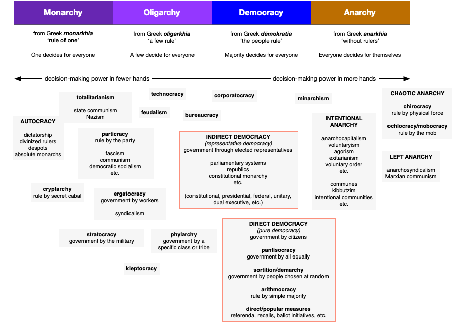 When I use the term “democracy,” I am (unless I specify otherwise) using it in its broadest sense: as a top-level category that describes any system in which decision-making occurs through a system of voting.